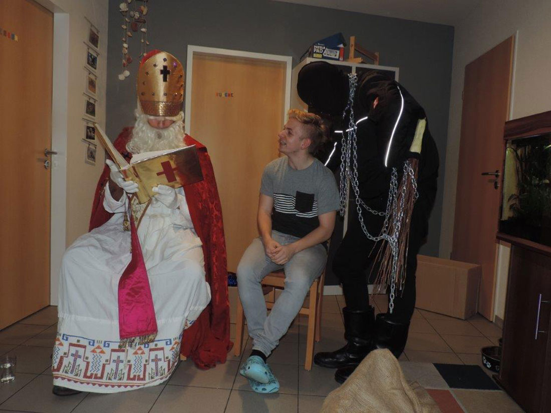 Ein Blick auf die Landkarte und schnell ist klar, warum der Nikolaus immer pünktlich in Kornelimünster eintrifft. Ein schneller Schlitten und die nahegelegene „Himmelsleiter“ machen es möglich. Und so klopfte es auch am vergangenen Mittwoch wieder vernehmlich an der Haustür der Außenwohngruppe des ZfsA. Schwer bepackt betrat der Heilige Bischof Nikolaus das Wohnzimmer. Wie ein schwarzer Schatten neben ihm: Knecht Ruprecht. Das ungleiche Paar sorgte für gespannte Stille. Was würde wohl im Goldenen Buch vermerkt sein? Hatte der Nikolaus wirklich über jeden Tag Buch geführt? Zur großen Freude der Kinder waren es wohl überwiegend die guten Dinge, die er sich notierte hatte, denn jede Bewohnerin und jeder Bewohner sowie alle Pädagogen wurden mit einer Nikolaustüte beschenkt. Gerne wäre der Nikolaus noch geblieben, hätte von den leckeren Plätzchen genascht und sich mit Kakao gewärmt, aber der Terminkalender ließ ihm keine Wahl. An vielen Orten wurde noch erwartungsvoll auf das Gespann gewartet, nicht alle so gut erreichbar wie unser Haus in „Knolle“.